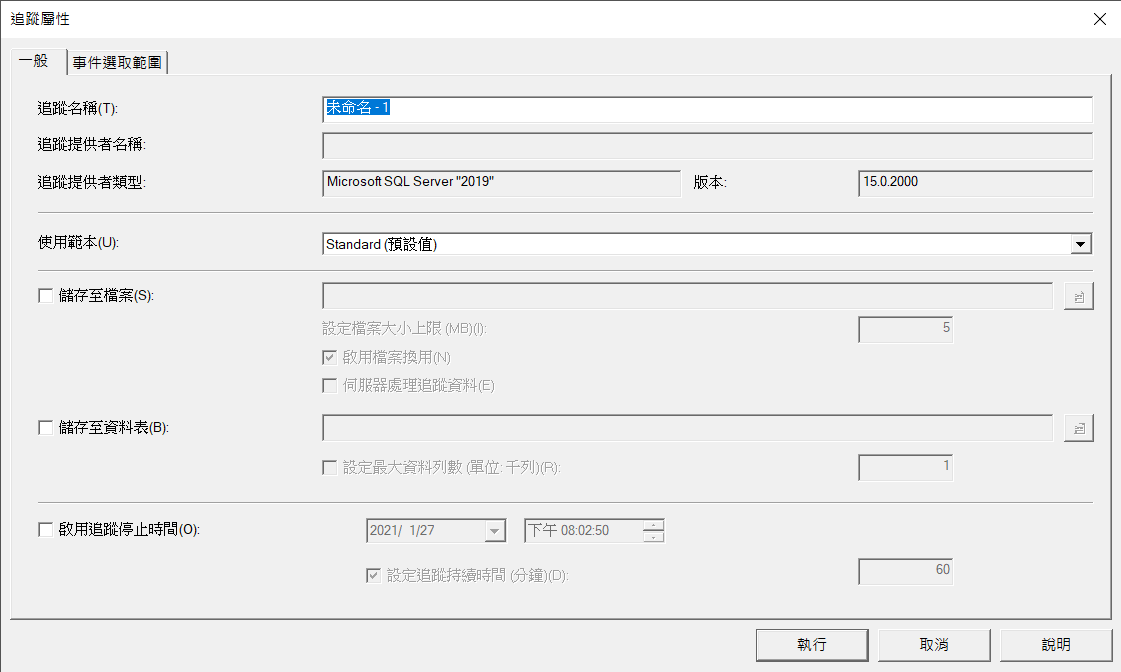 新增追蹤,並選擇要使用的追蹤範本,範本定義了要監督的與 SQL Server 進行的行為種類。