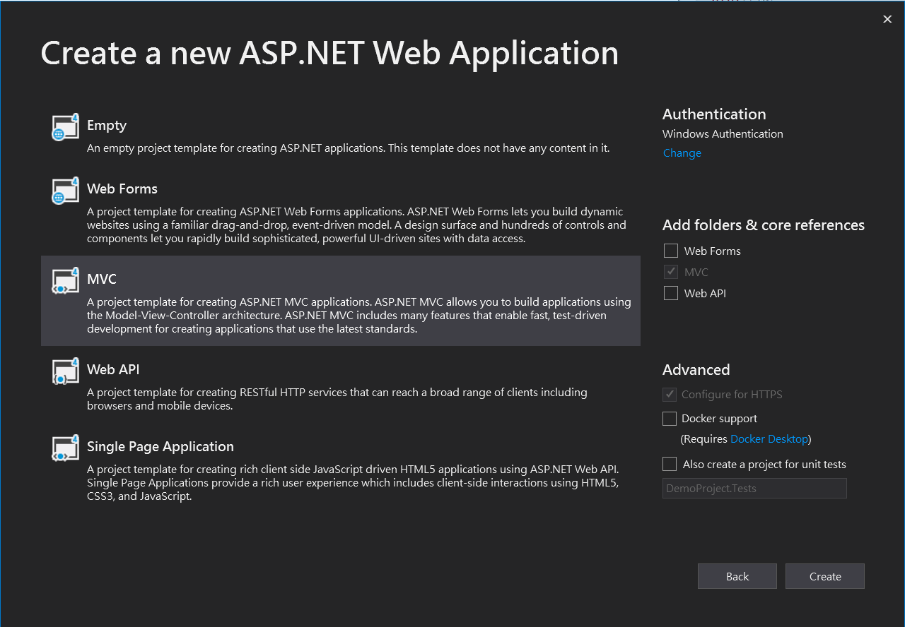 選項選擇 MVC , 驗證方式因為在 AD網域環境使用,所以選擇 Windows Authentication