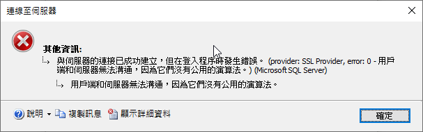 與伺服器的連接已成功建立,但在登入程序時發生錯誤。 (provider: SSL Provider, error: 0 - 用戶端和伺服器無法溝通,因為它們沒有公用的演算法。) (Microsoft SQL Server, 錯誤: -2146893007)用戶端和伺服器無法溝通,因為它們沒有公用的演算法。