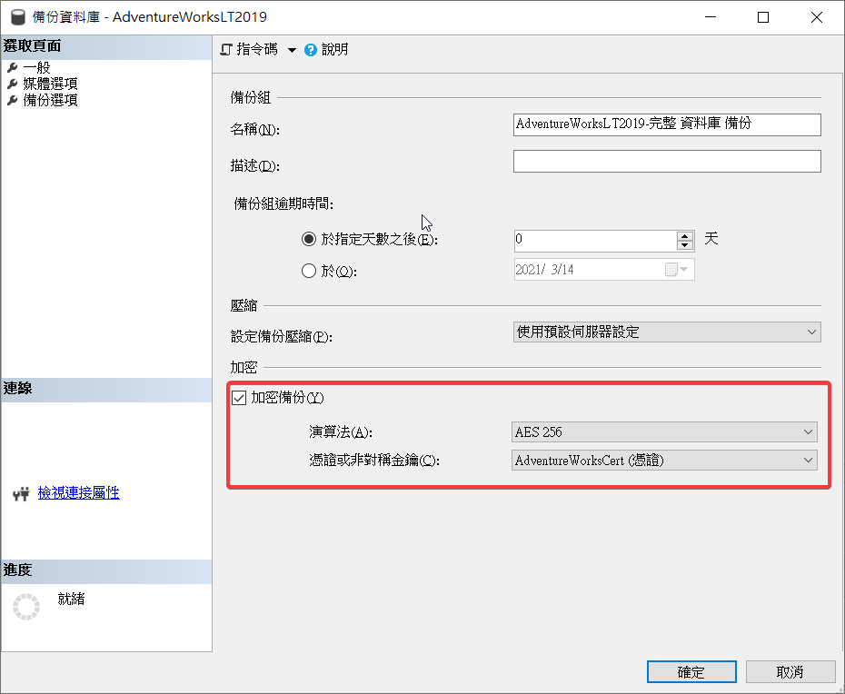 如果使用 SSMS GUI 來操作的話,必須勾選備份至新的媒體集才能夠進行備份檔的加密。