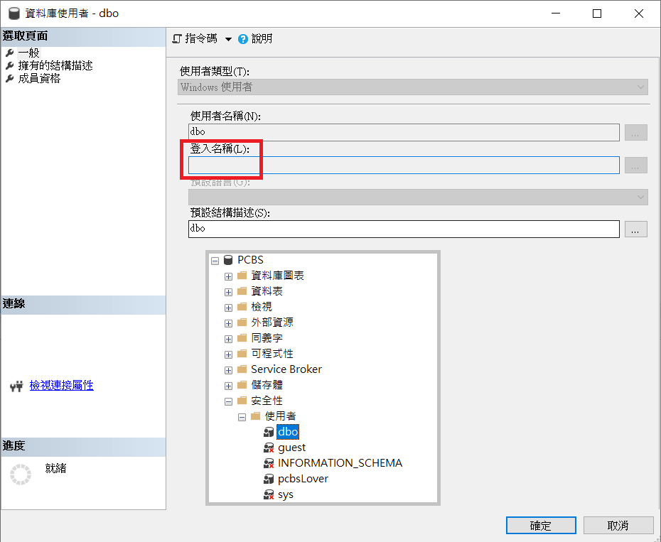 截圖中的資料庫因為是從其他位置還原過來,所以沒有對應到登入,這也表示 dbo 是可以沒有對照到登入、資料庫是可以沒有擁有者的。