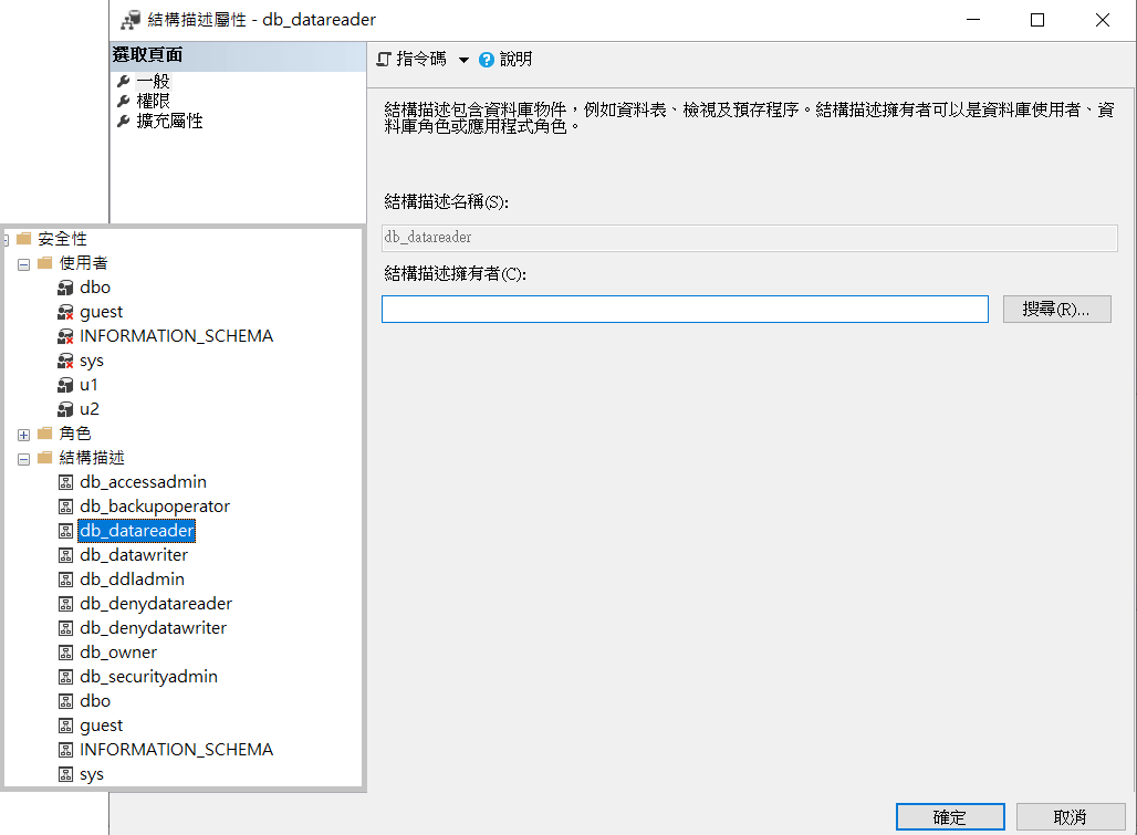 要注意的是使用者不會因為擁有 dbo 描述結構,就具備 dbo 使用者的 db_owner 權限,擁有結構描述僅會擁有該結構描述下的資料庫物件。
