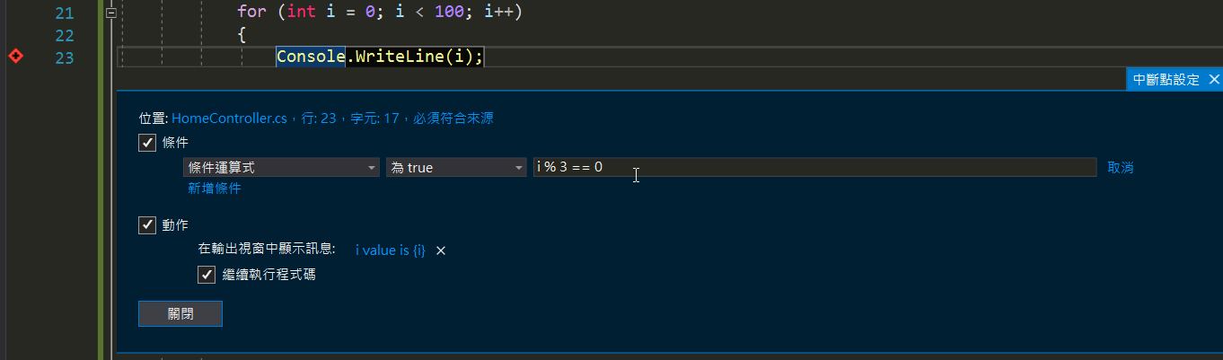 中斷點可以設定觸發的條件,對於迴圈的檢查情境下,只有當屬性符合特定的規則才會觸發中斷點,可以加速除錯的步驟。