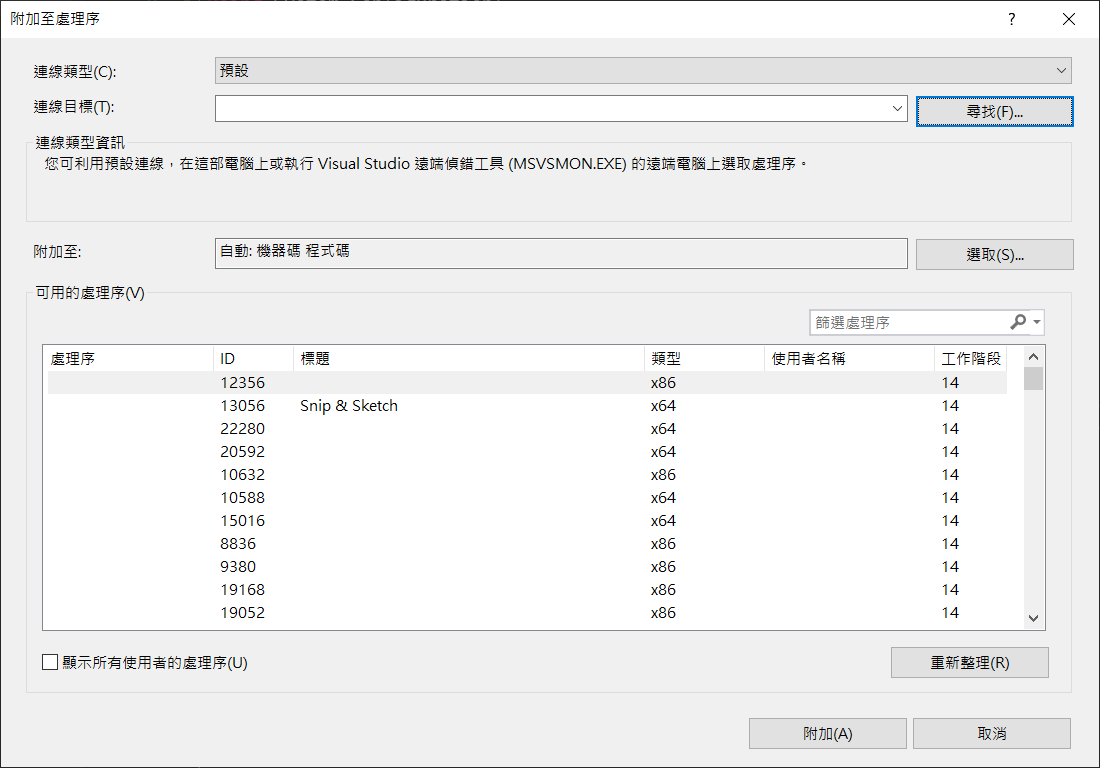 遠端伺服器必須安裝 Remote Tools,Client 端可以藉由 Attach Processes 的方式連線到遠端伺服器並進行除錯。