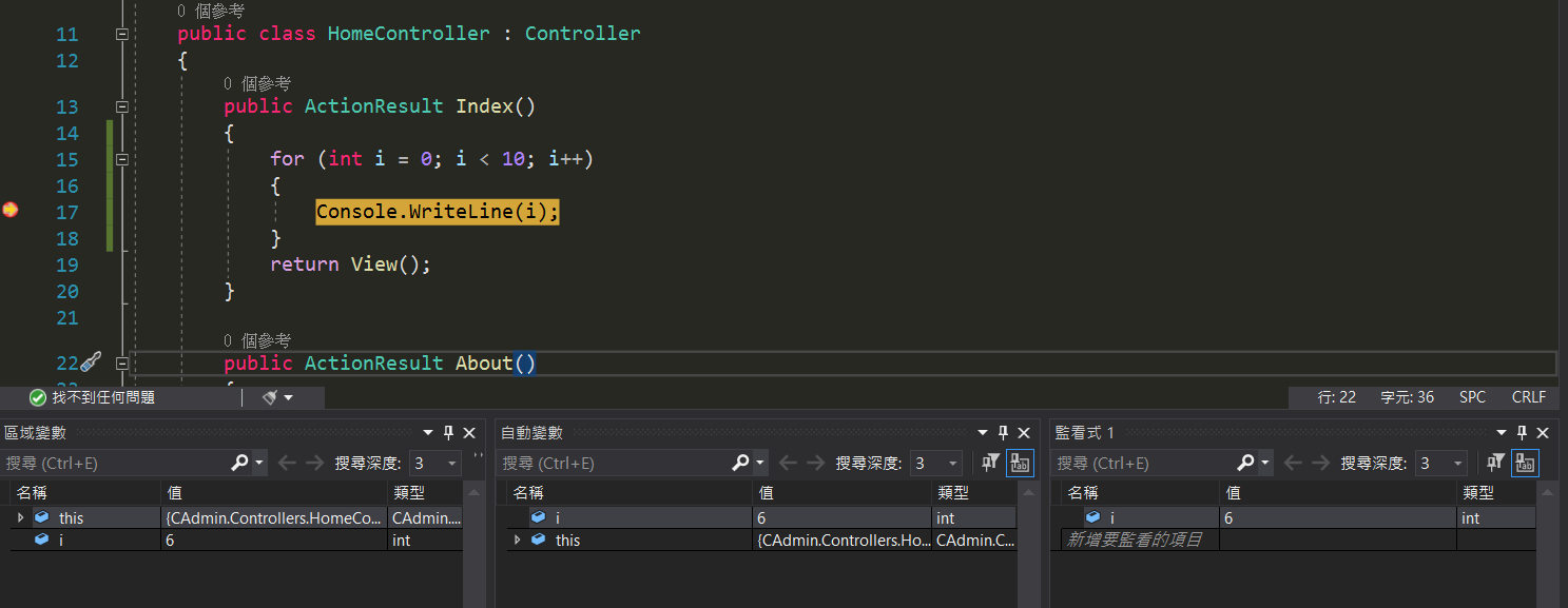 快捷鍵 F9 設定後,使用除錯模式運行應用程式,當觸發到中斷點會自動停止,並且可以檢視自動變數(Auto)與區域變數(Local)。