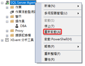 設定完 SQL Server Agent 郵件設定檔後,必須要重新啟動 SQL Server Agent 才能夠正常的寄送郵件通知操作員。