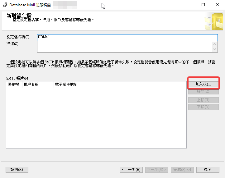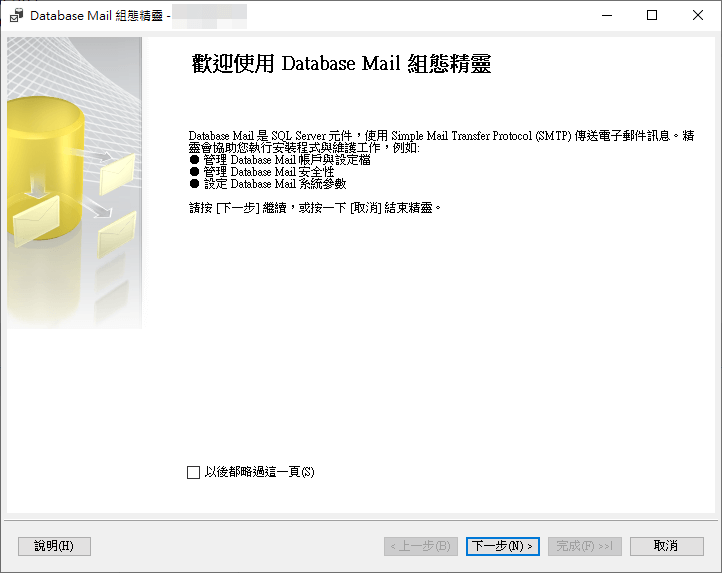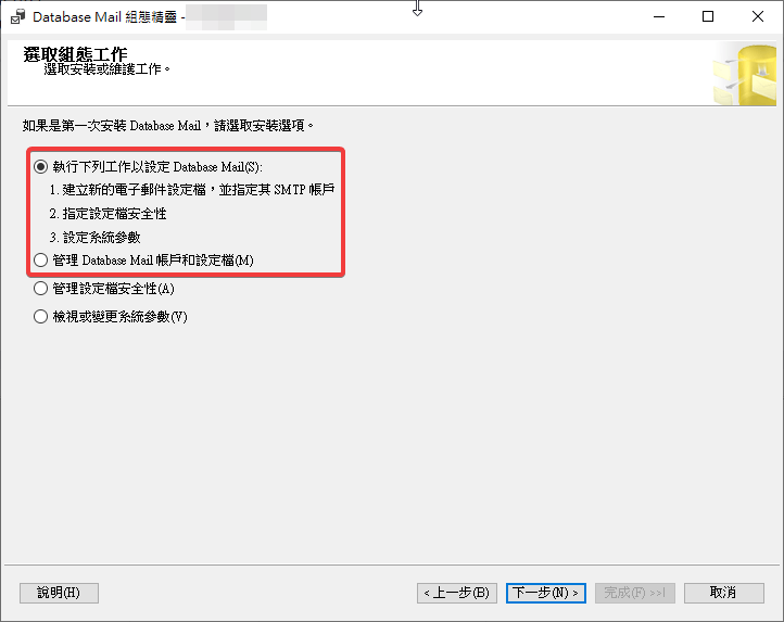 第一次建立 Database Mail 設定檔選擇第一個選項;如果已經建立過設定檔要維護的話選擇第二個選項。