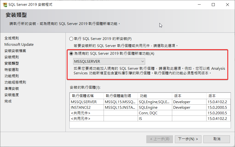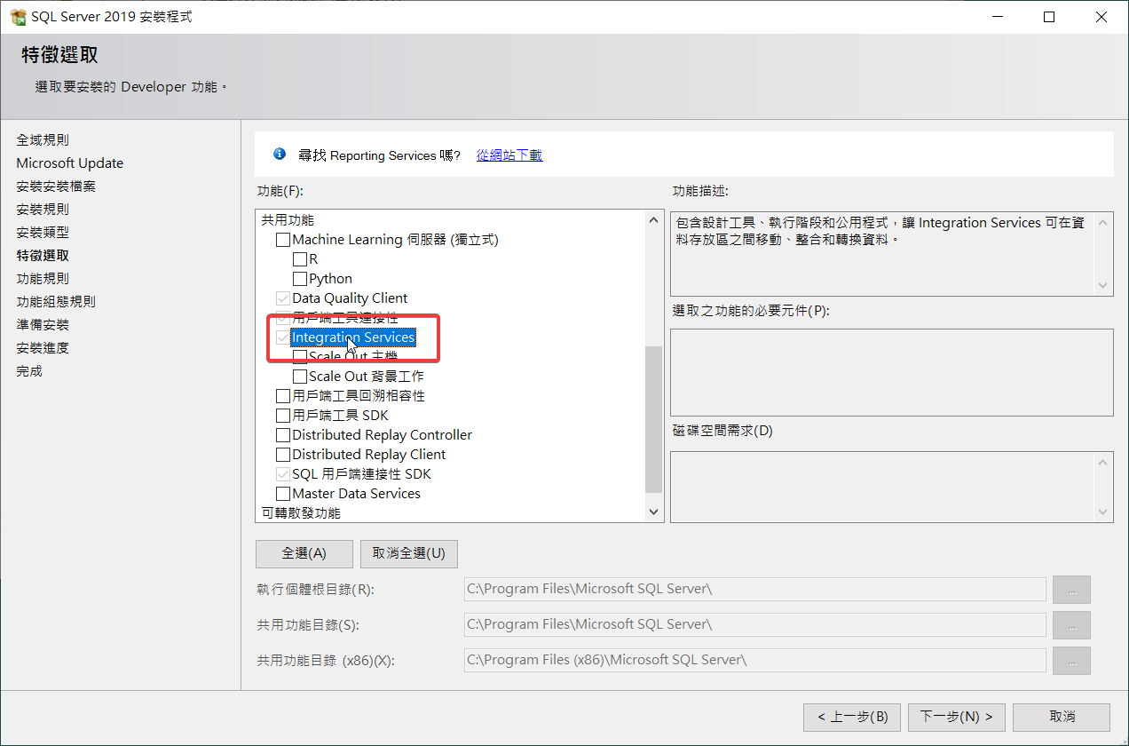 如果當初在安裝 SQL Server 的時候沒有使用安裝 SSIS,則使用 Source (安裝檔) 對已經安裝的 Instances 新增功能。