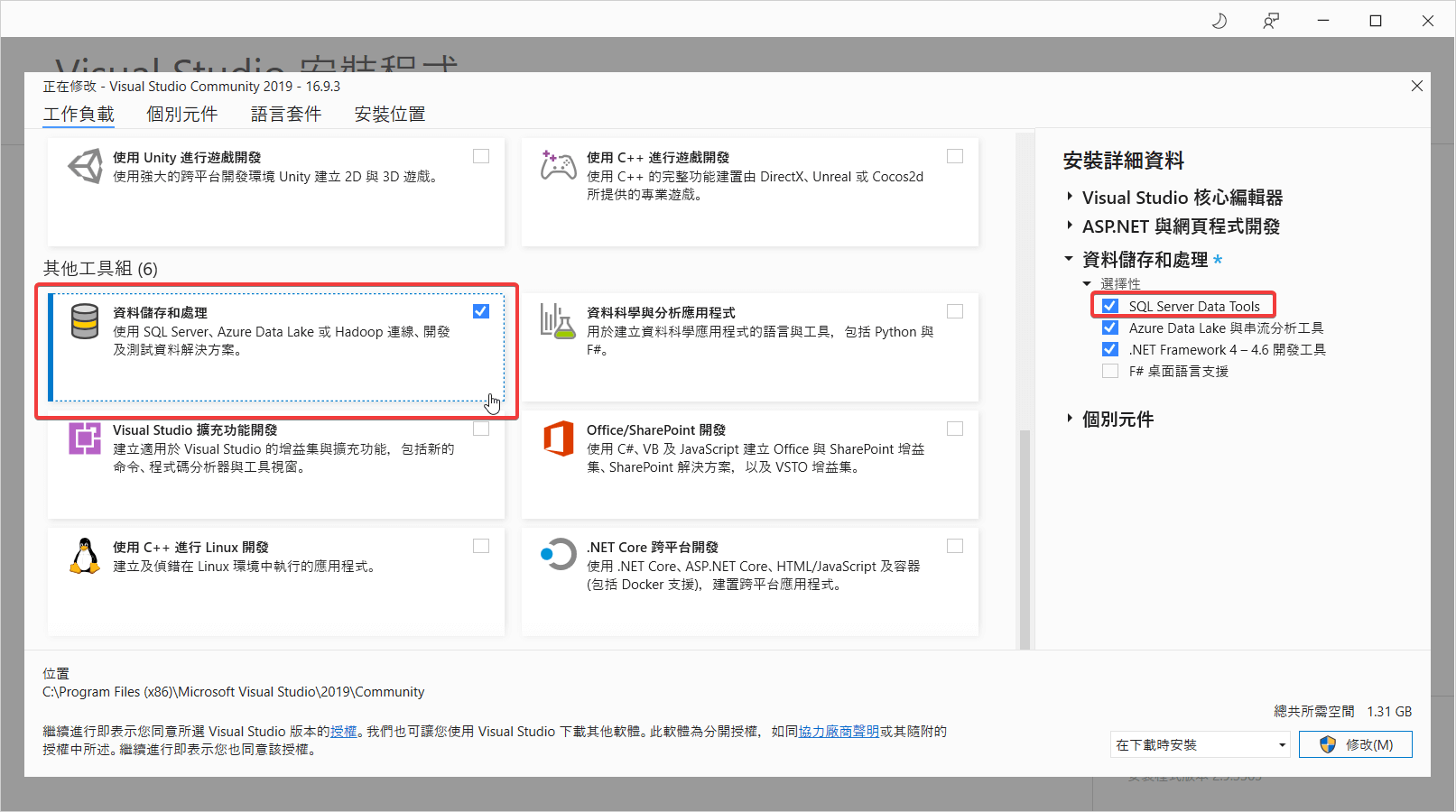 Visual Studio 2019 使用「Tools」接續「Get Tools And Features」後,找到「SQL Server Data Tools」並安裝。