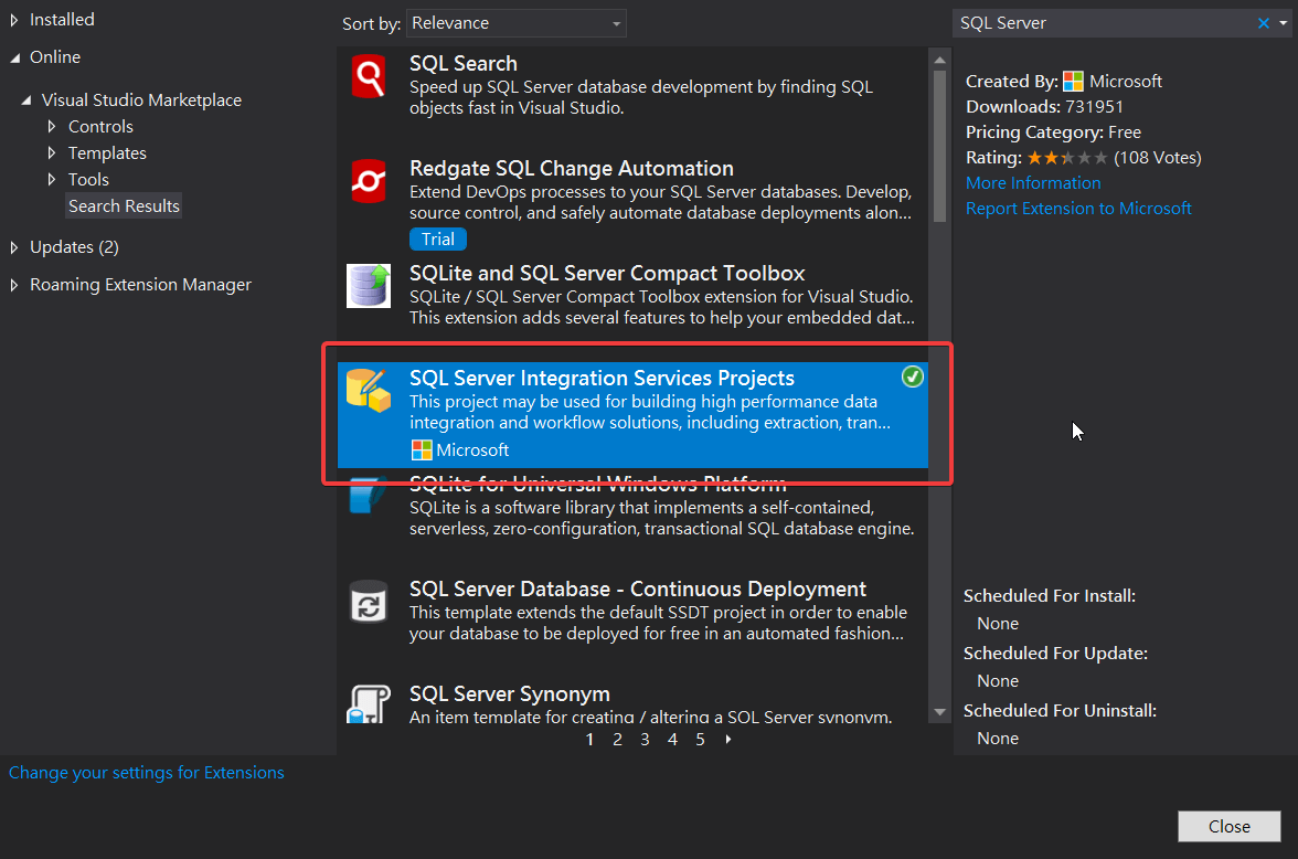 Visual Studio 2019 使用「Extensions」接續「Manage Extensions」後,搜尋「SQL Server」找到 「SQL Server Integration Services Projects」 後進行安裝。