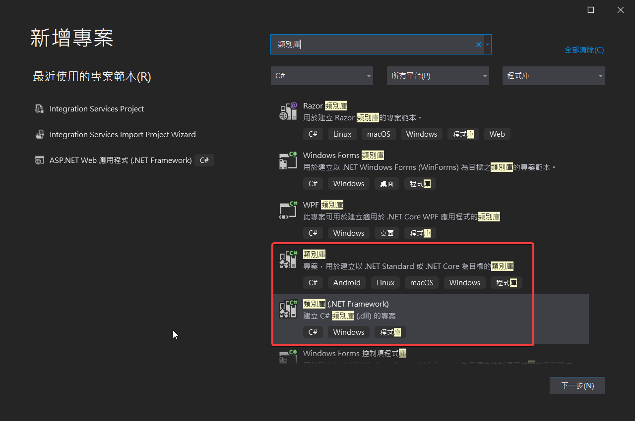 專案的建立可以選擇專案的類型,其中可以選擇的有「類別庫」以及「類別庫(.NET Framework)」,如果另外有安裝 .NET Core SDK 的話,還會有「類別庫(.NET Core)」。如果是單純開發 .NET Framework 的情況,只要使用「類別庫(.NET Framework)」即可。如果同時有使用 .NET Framework 以及 .NET Core 則需要使用「類別庫」才能讓共用編譯後的 DLL。