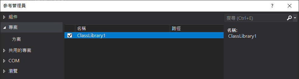 對要參照的專案加入參考,並選擇類別庫的專案後就完成了參考設定。之後只要藉由 using 使用該類別庫,就可以 reuse 相關函式庫的功能。