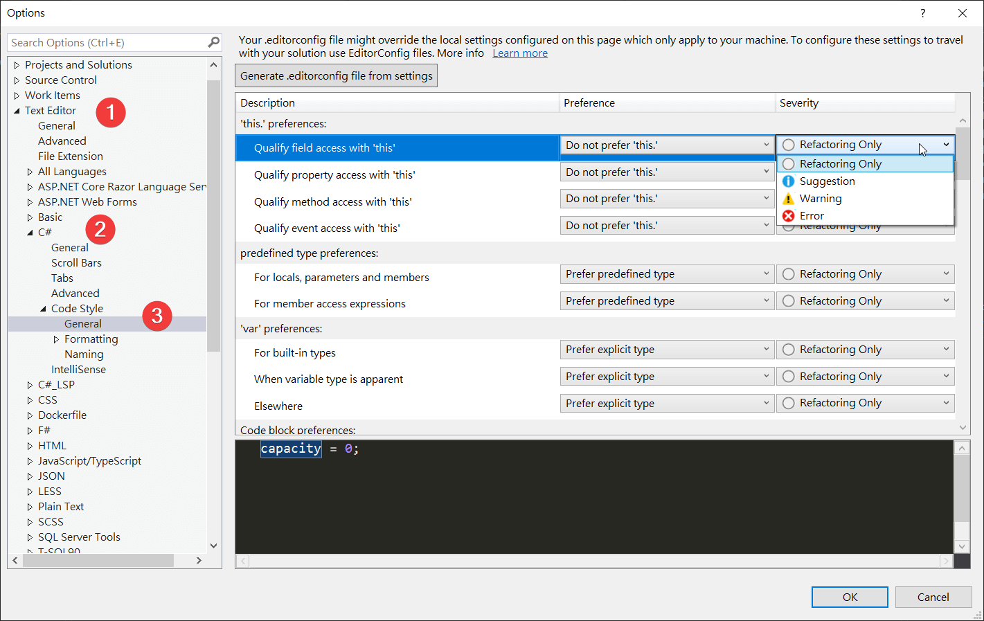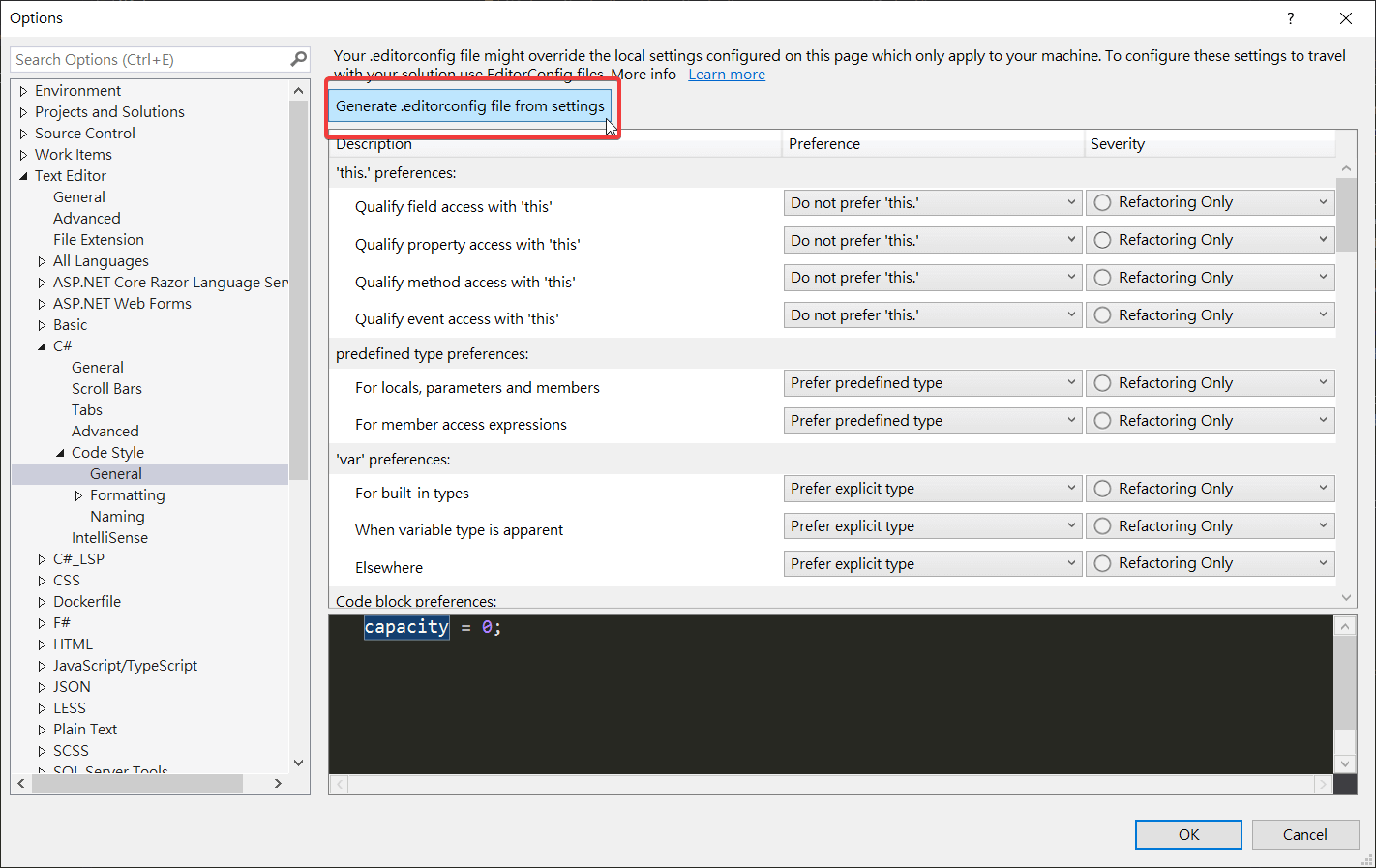 Code Style 是整個 IDE 層級的設定;另外可以產生 editorconfig 作為解決方案層級或者專案層級的專屬設定,其優先性會高於 IDE 層級的 Code Style 設定,並且易於共同開發者擁有一致的設定。