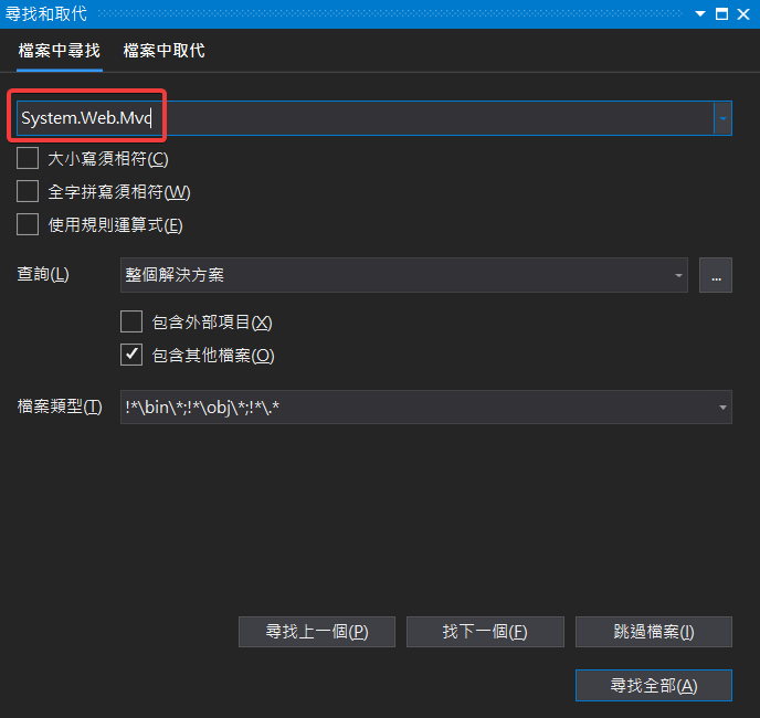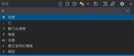使用 Ctrl + Q 搜尋,可以用於尋找 Visual Studio 的功能或者是搜尋檔案,可以加速功能的尋找。檔案的搜尋則建議使用下一個介紹的 Go to。