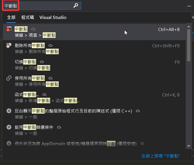 要注意的是中文環境下,必須交互用中文、英文才能查到所需的功能,例如中斷點,搜尋 Breakpoint 會找不到結果。