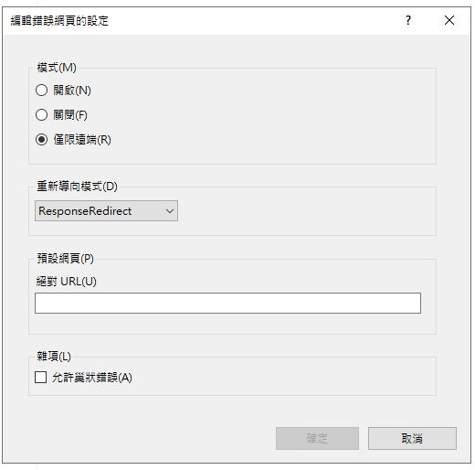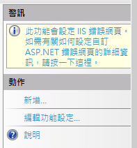 這邊是指 ASP.NET 中發生的錯誤訊息該如何呈現,例如 MVC 框架中 Runtime 的錯誤。其中開啟模式是指遠端以及本機都使用客製錯誤訊息,預設的僅限遠端只有遠端或使用客製錯誤訊息,本機則會是詳細錯誤訊息。如果要在遠端呈現完整錯誤訊息,必須選擇關閉。
