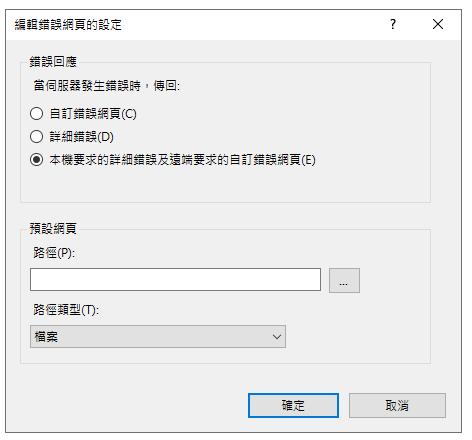 本機要求的詳細錯誤及遠端要求的自訂錯誤網頁