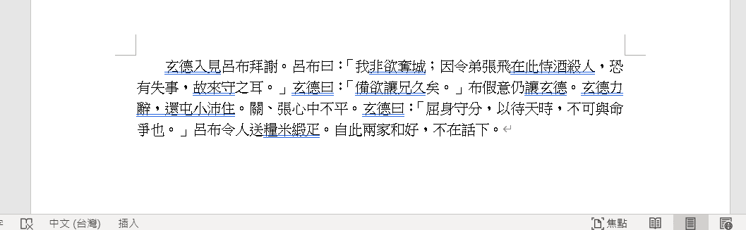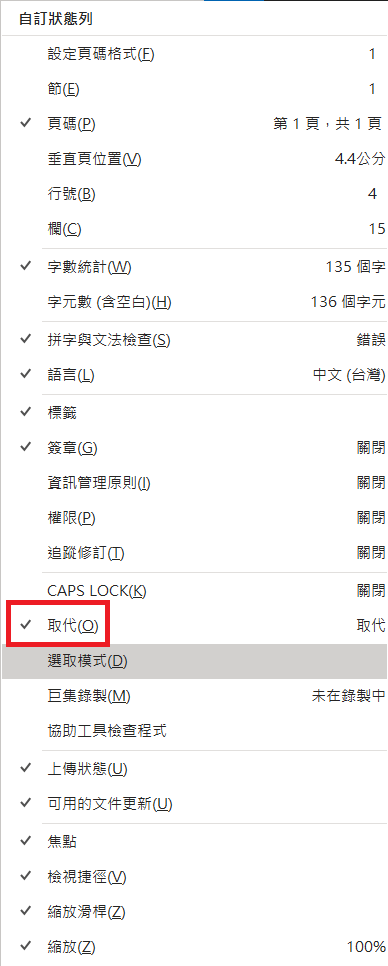 如果要切換輸入狀態,可以點選 Word 下方功能列表的 插入/取代 做轉換,或是使用鍵盤上的 Ins 鍵也可以做切換。