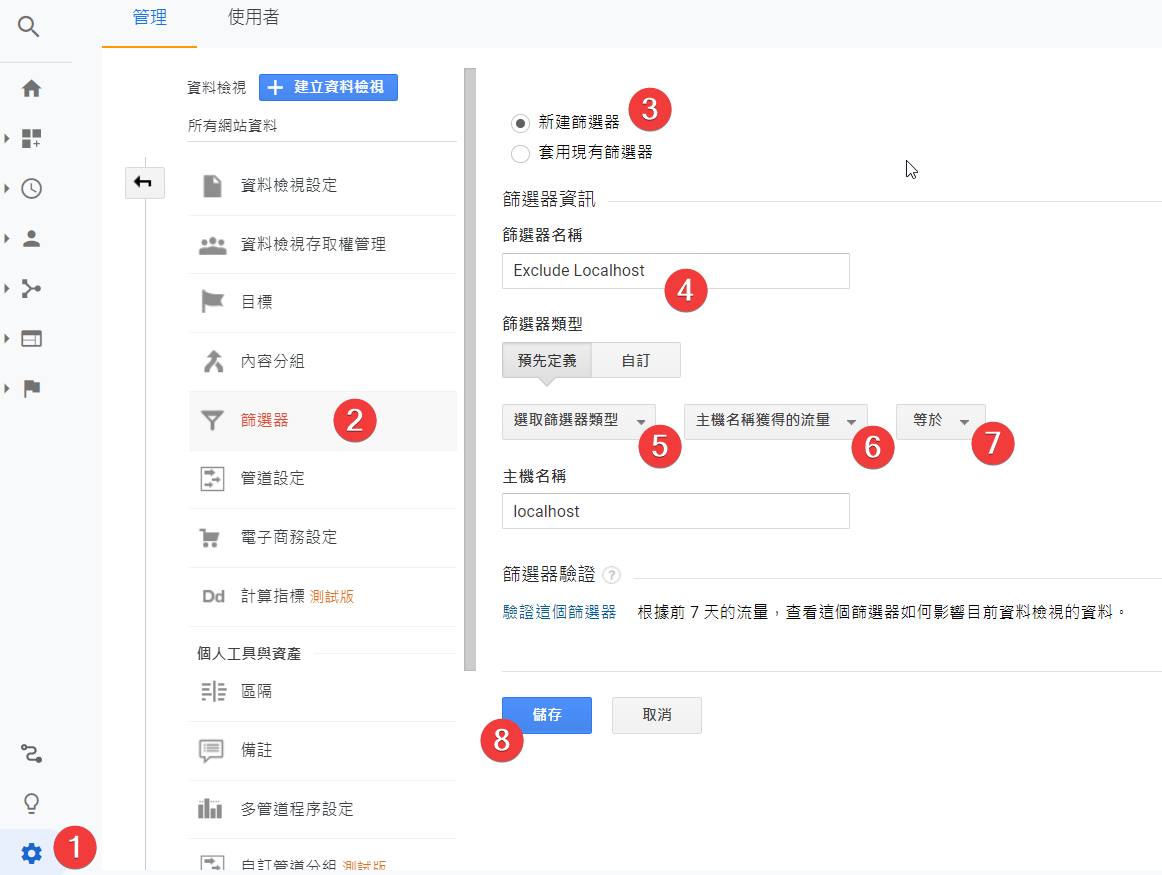 篩選器的設定,不會影響既有蒐集到的資料。因此對於 localhost IP 的排除會是在設定篩選器之後開始作用,同時一旦設定篩選器,在篩選器作用期間的資料不會包含 localhost 的瀏覽紀錄,縱使事後取消也無法恢復篩選器啟用期間的排除,這一點要特別注意!