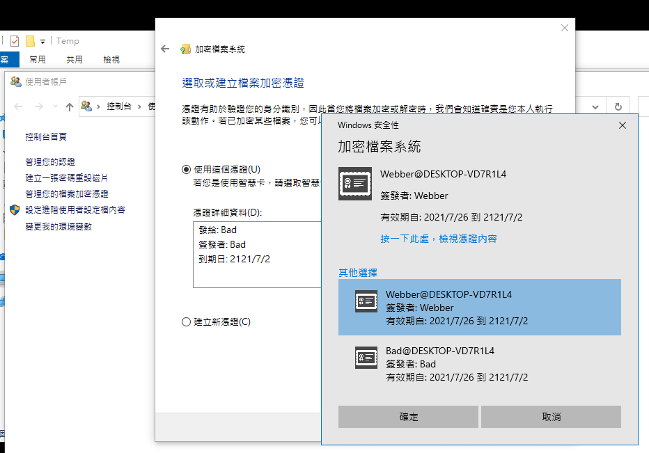 可以使用 使用者帳戶 來檢視目前用於加密檔案的加密檔案憑證,如果個人\憑證中有多張憑證,可以從這裡切換選擇。而如果是要解密檔案,作業系統會自動從多張的加密檔案憑證中自動選擇適合的檔案。