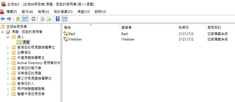 第一次使用加密檔案系統,會自動產生一張檔案加密憑證並儲存於 個人\憑證 當中。