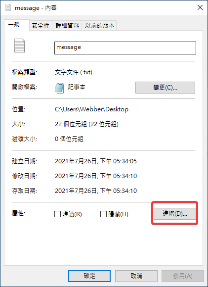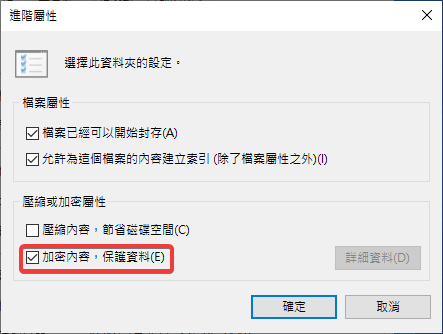 加密的第一步為對檔案右鍵並點選內容後,依序選擇進階與加密內容,保護資料: