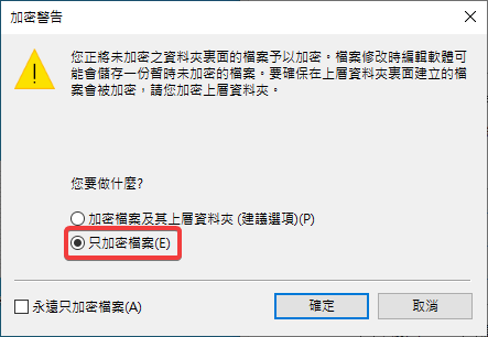 最後在加密警告的部分,要注意如果檔案是在桌面上使用「加密檔案及其上層資料夾」會導致日後所有新增在桌面的檔案都被自動加密,很不方便。