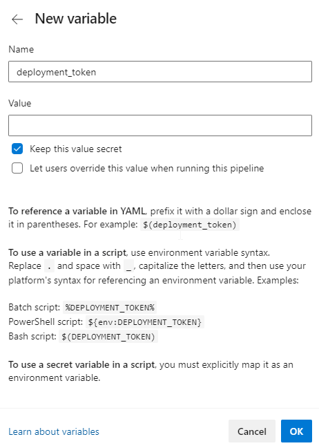 再將從 Azure Portal 取得的 Deployment Token 加入到 Variable 當中,Variable 名稱設定為 deployment_token