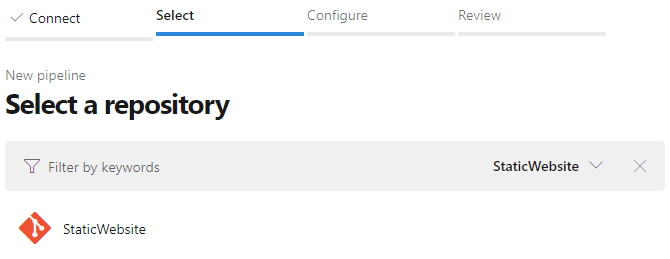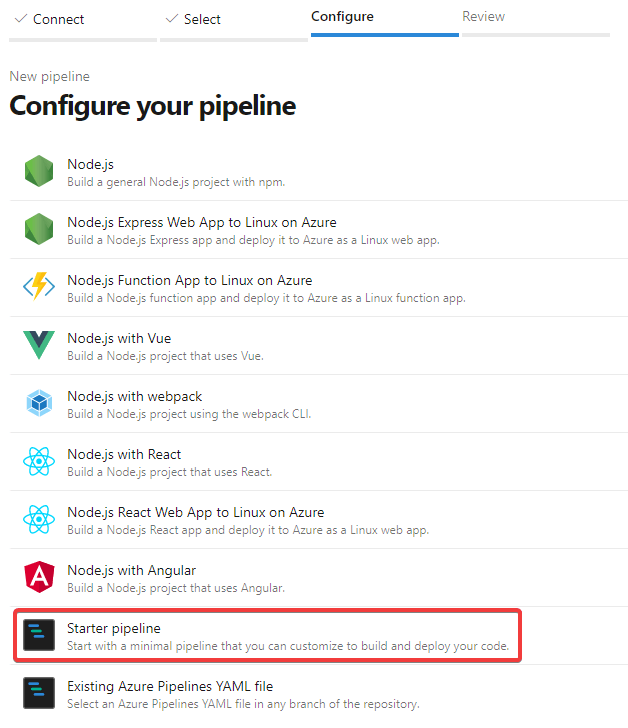 選擇要使用的 pipeline configuratio,本次是純粹的 JS Web App,選擇 Starter Pipeline