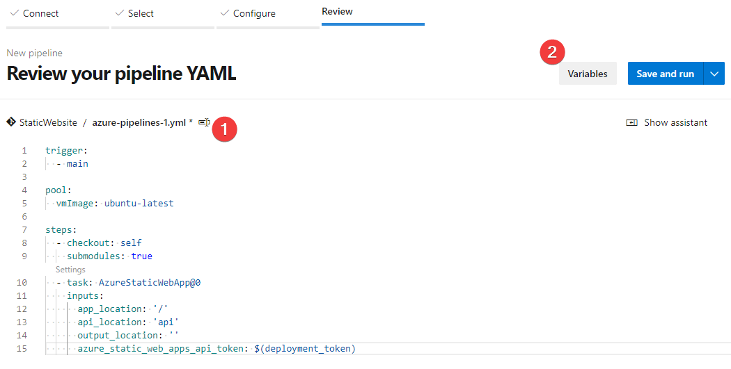 接著設定 YAML,相關重要的部署設定都是由 YAML 這邊進行,例如告知專案編譯後的位置、azure function 所需要的 api 位置等等: