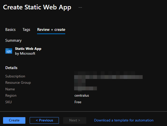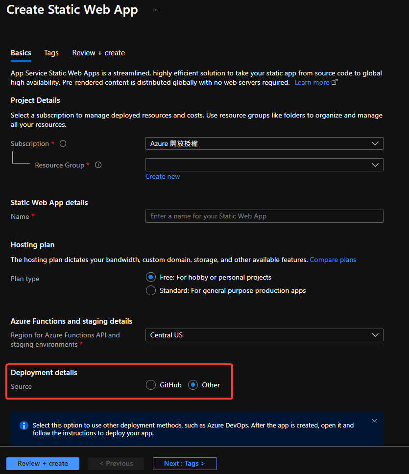 首先登入 Azure Portal 後,搜尋 Static Web App 後,進行下列建立動作: