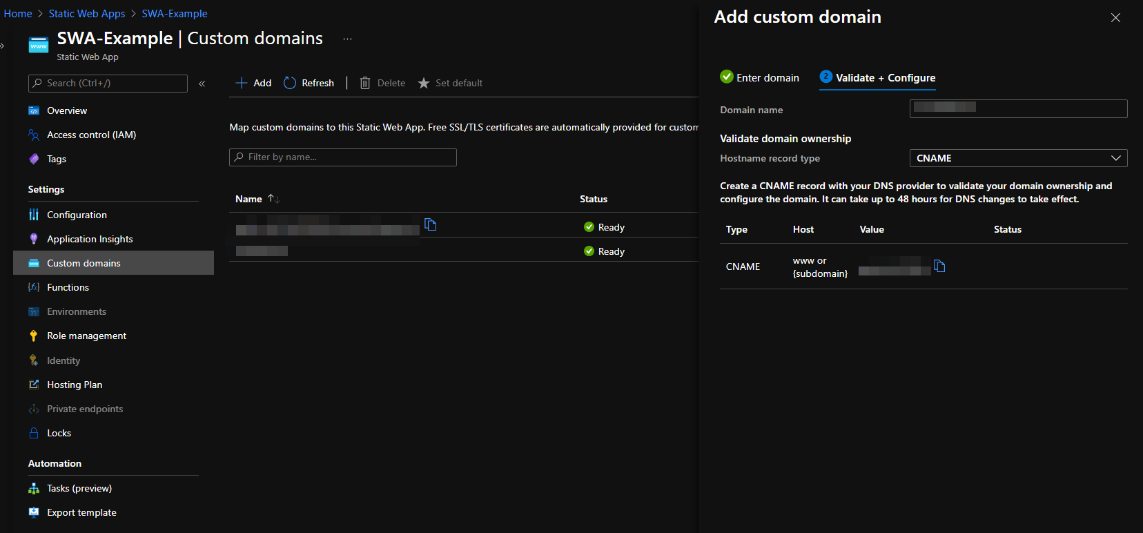 Custom Domain 的設定相當容易,只要先從 DNS Provider 端加入一組 CNAME,分別對應要使用的 subdomain 以及 Web Static App 配發的網址,等待生效後再從 Azure Portal 的 Custom Domain 進行設定即可。