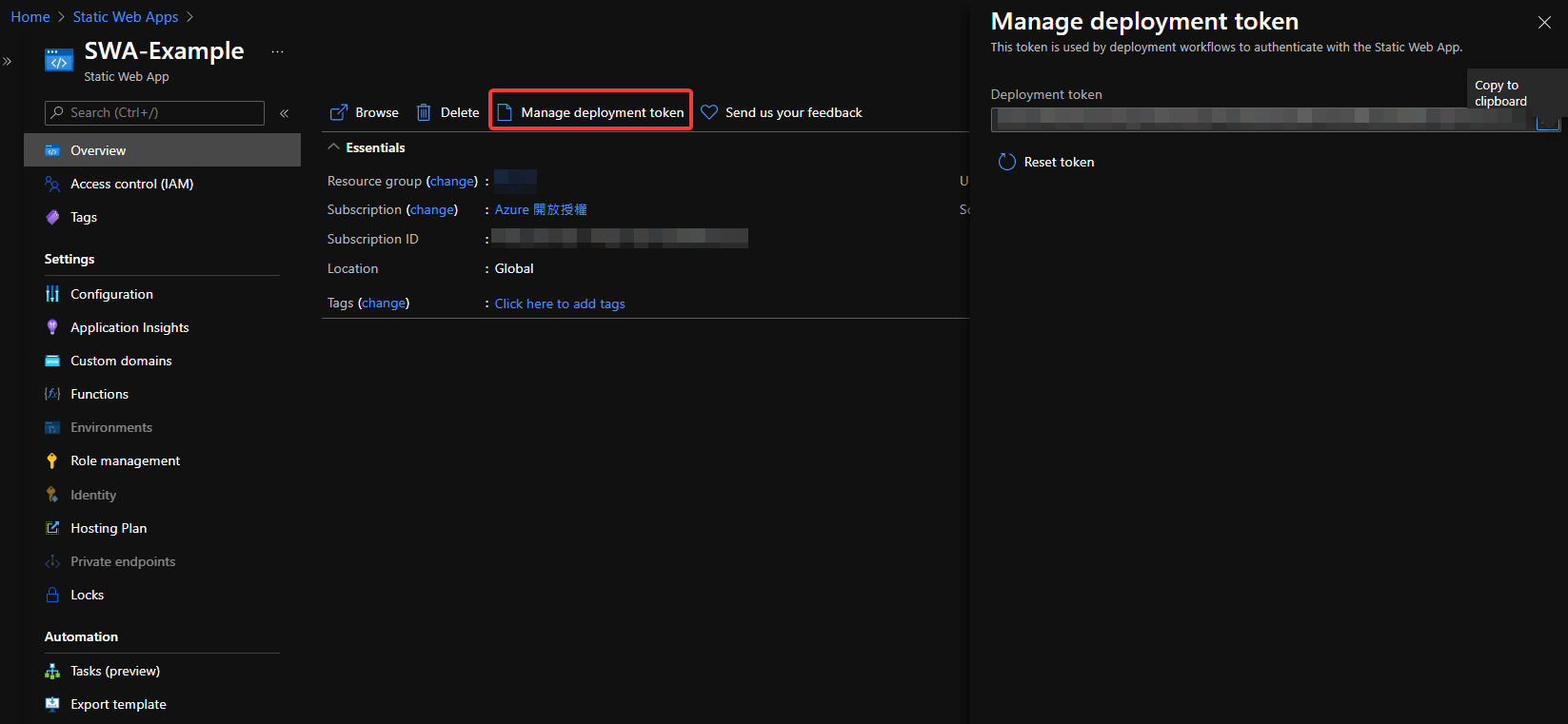 選擇「Manage deployment token」可以查看部署程式碼所需要的 token,稍後在 Azure DevOps 設定 pipelines 的時候會需要。