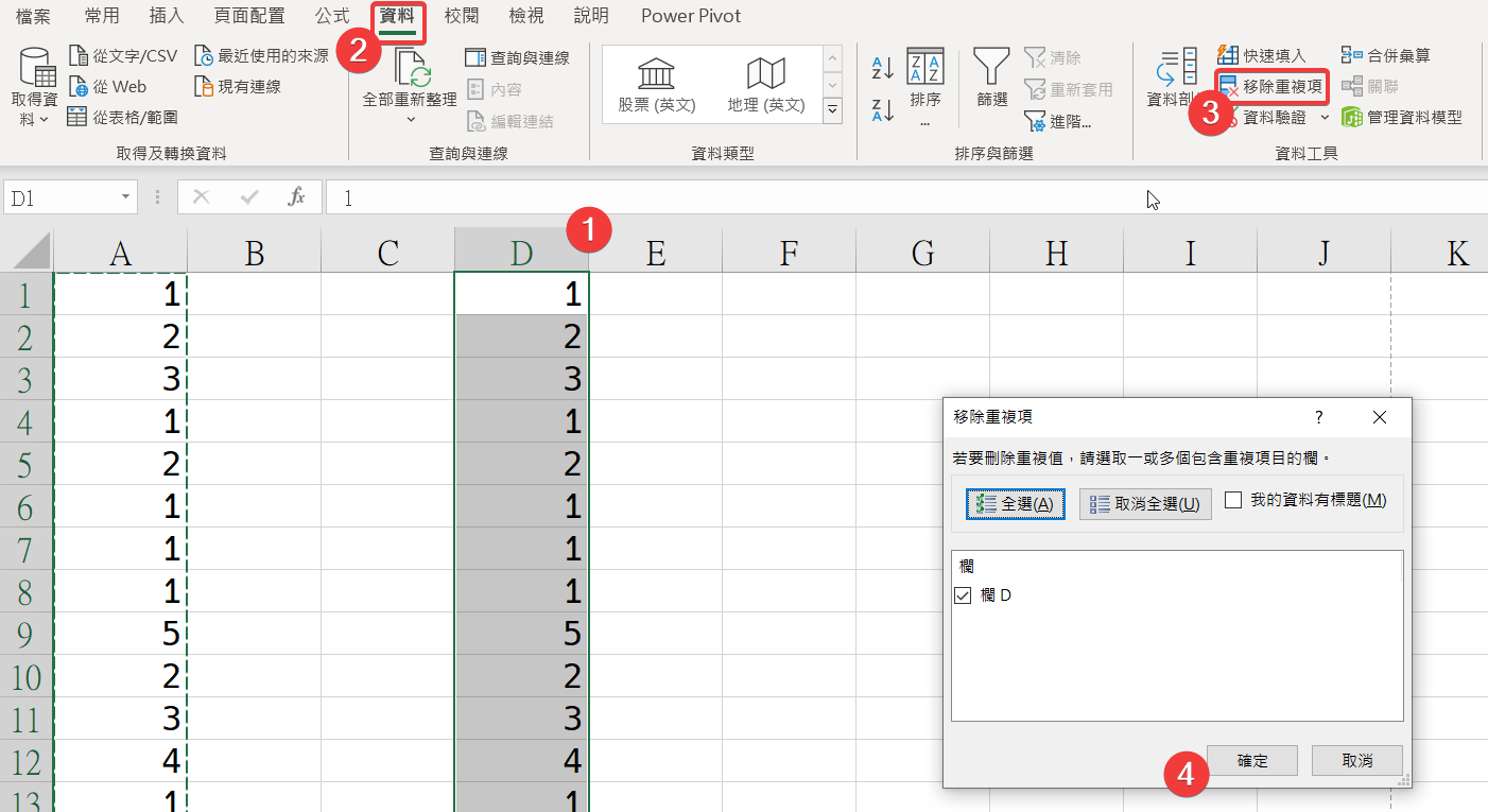 首先將資料貼上 Excel,並選取所有資料另貼上一欄,並移除重複的項目: