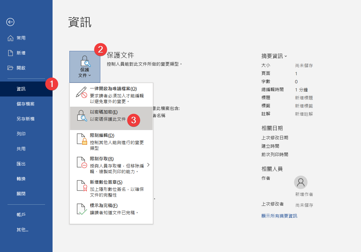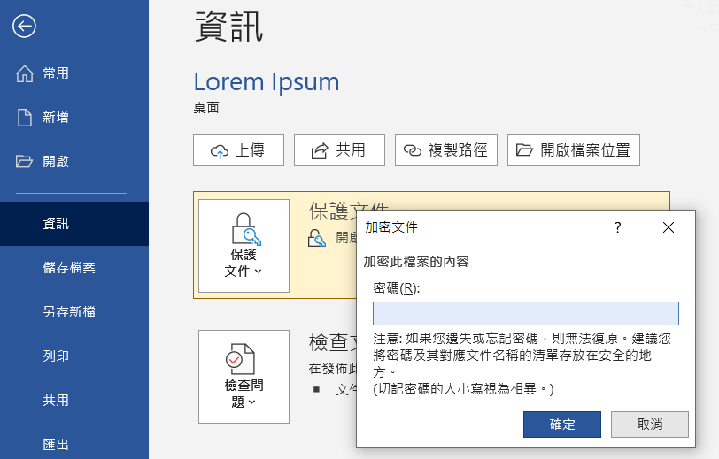 如果要取消密碼,回到資訊後調整保護文件的方式,再次點選密碼保護並不輸入任何資訊以解除。