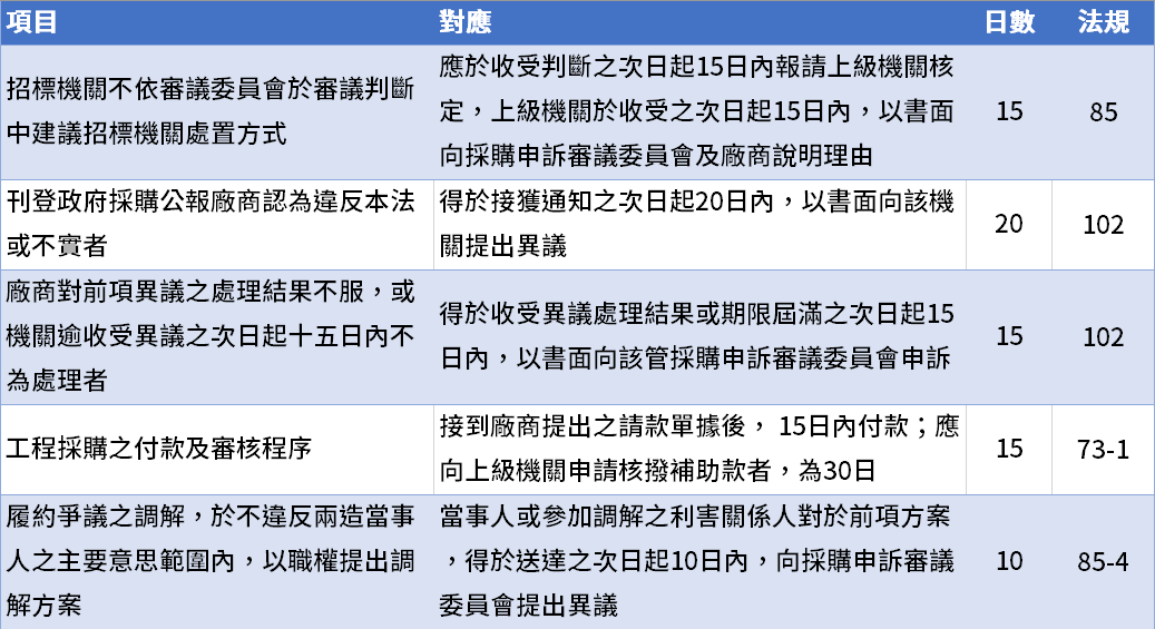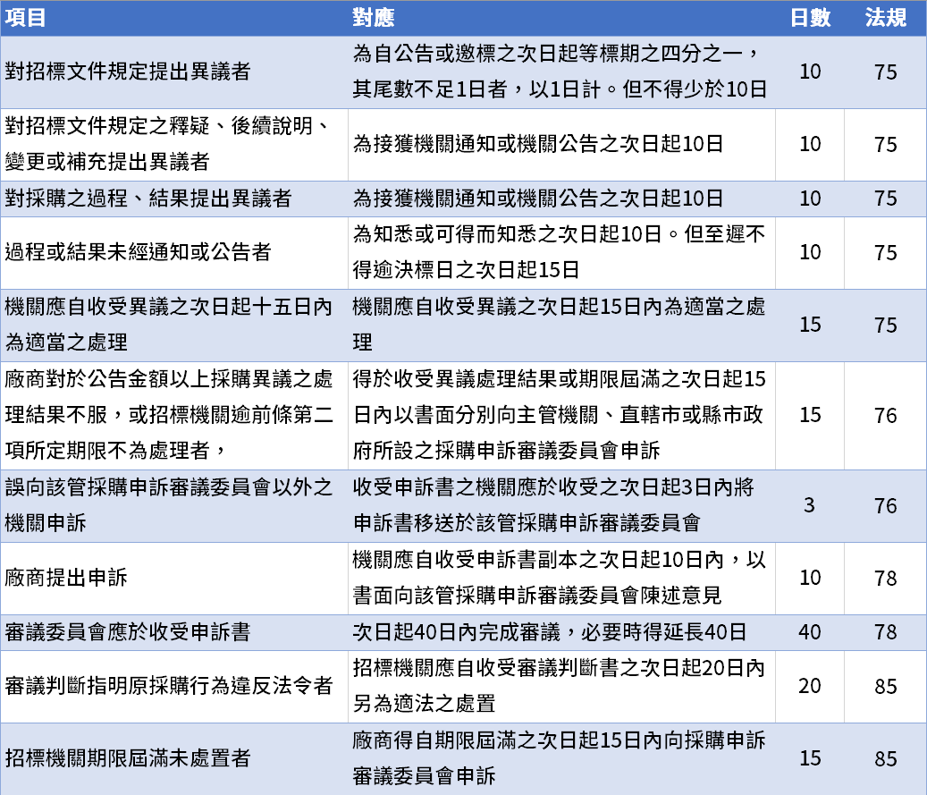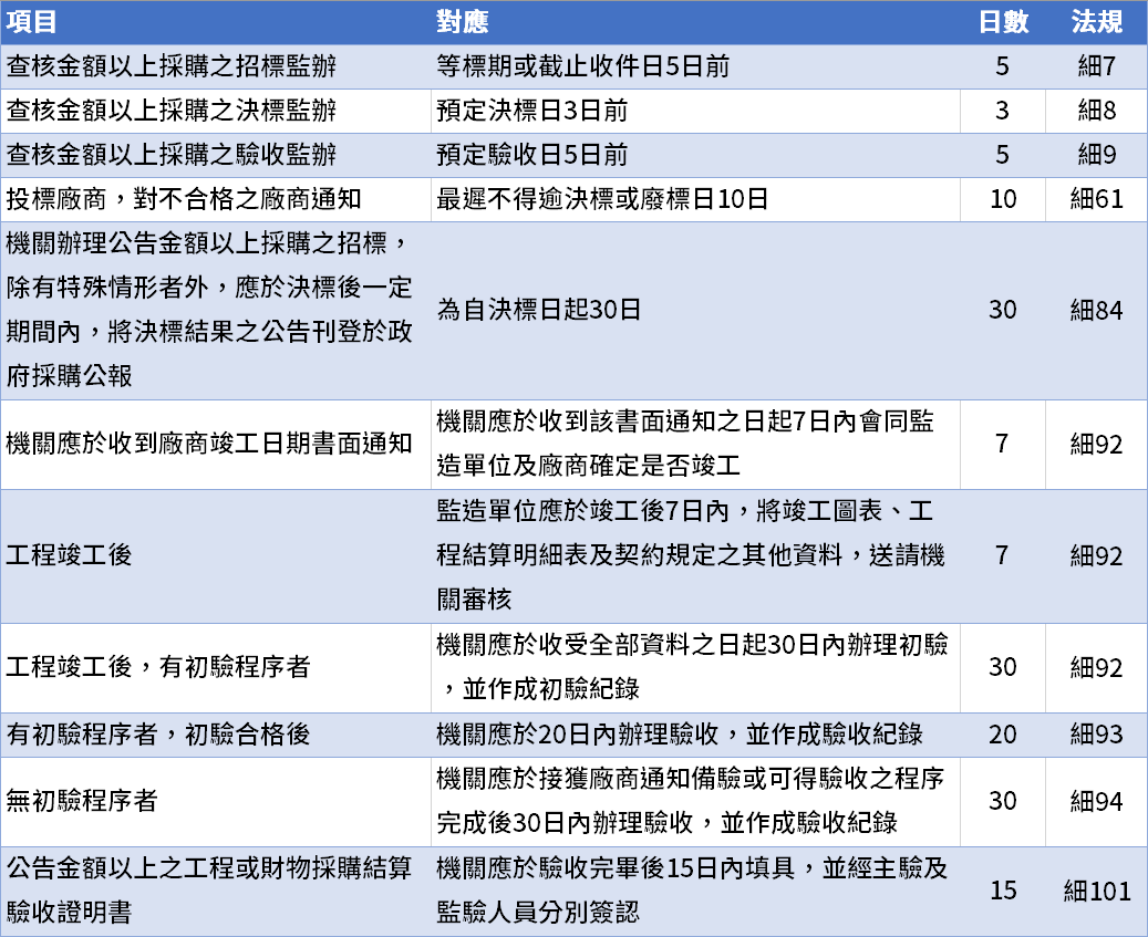 綜整政府採購法中所出現的各式日數,並整理為易讀好背的表格。