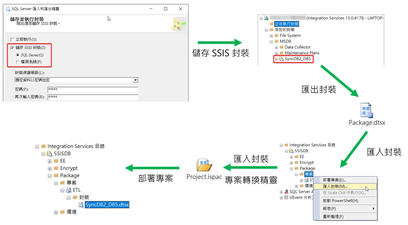 - 第一種是匯入封裝,也就是將 dtsx 轉換為 ispac,接著再將 ispac後再進行專案部署的方式