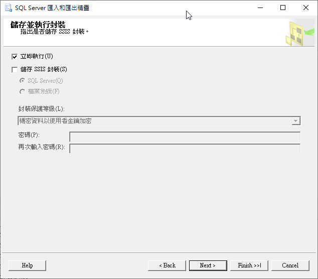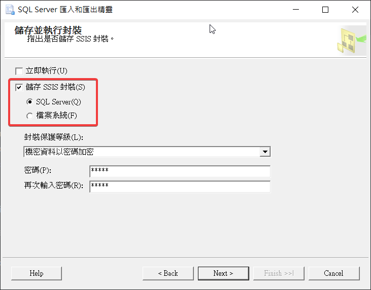 如果經常要進行相同的資料表抄寫,每次都進行設定也是相當麻煩。這個時候可以不選立即執行,而改選封裝為 SSIS。封裝目的地包含檔案系統以及 SQL Server,這邊我們選擇 SQL Server: