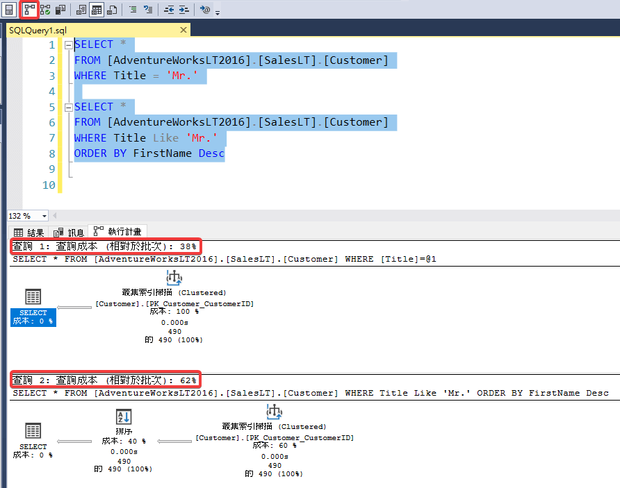 同時選取不同的查詢語法後執行,執行時間佔比少者為效率較佳的查詢,第二個查詢故意加上排序,所以相對時間比 62 % ,費時較多,效率也較差。