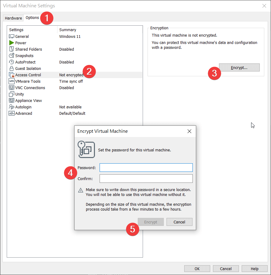 在虛擬機的 Settings 中 依序選擇 Options > Access Control > Encrypt,之後輸入一組保護密碼。