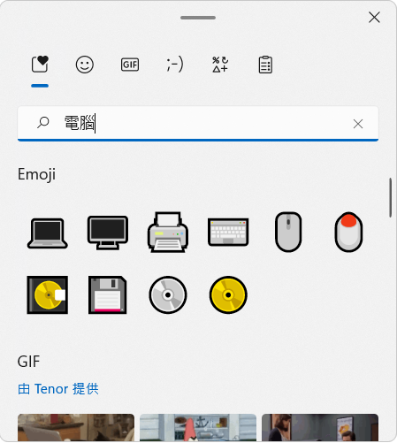 有一些想要抱怨的小缺點,其中一個是顯示設定文字大小放大 125% 或 150%等,部分的使用者介面、應用程式仍然會發生文字糊糊的問題,但維持在 100 % 文字大小,觀看上很費力。此外原本 Windows 10 實用的 Emoji 輸入功能在 Windows 11 上多了 Gif 變得好花俏,此外開始支援中文輸入來搜尋 emiji 這點倒是不錯。