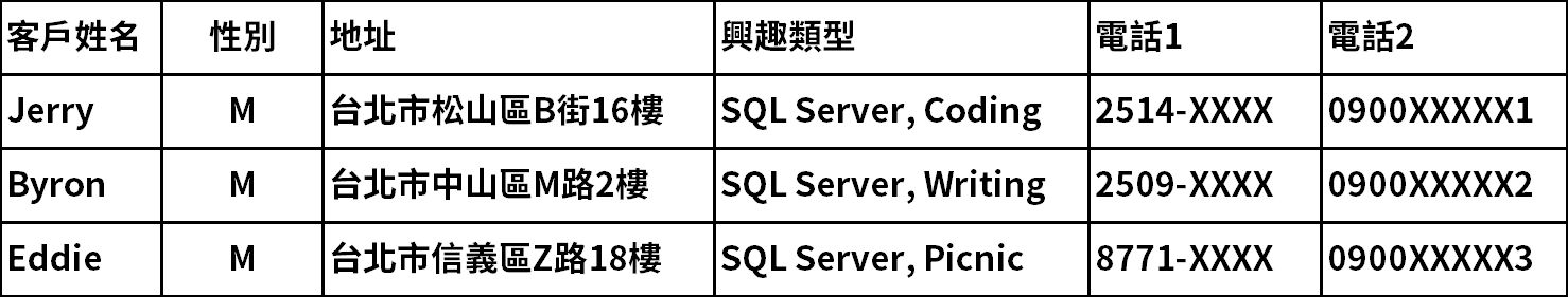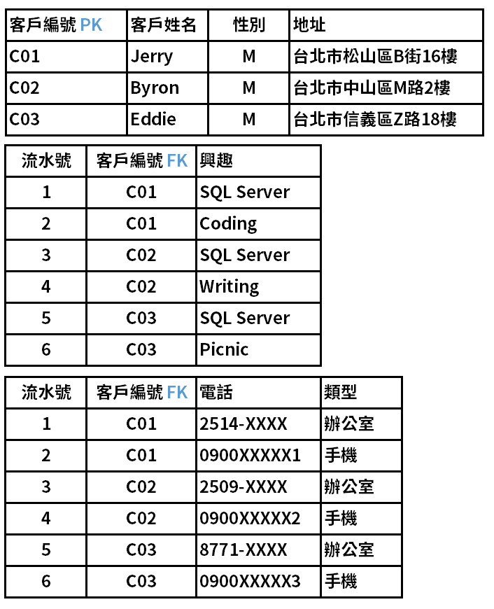 經過調整,增加主鍵,並且另外拆出兩種資料表用於存放興趣以及電話,解決單一欄位儲存多個值以及重複意義欄位的問題。