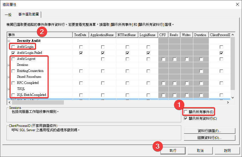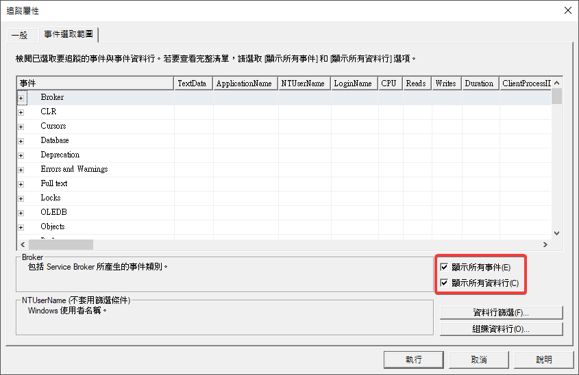首先要先勾選顯示所有事件以及顯示所有資料行