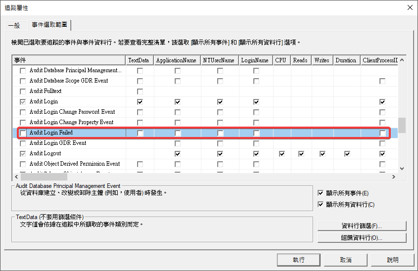 最後移除顯示所有事件,並取消勾選 Audit Login Failed 的事件,完成後執行。