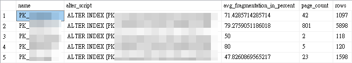 進行 REBUILD 或者 REORGANIZE 的判斷在於 avg_fragmentation_in_percent,示範腳本是以 30 為分界,此外要大於 10 才會顯示 😋