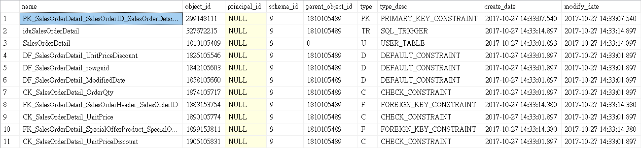 name = 'SalesOrderDetail' OR OBJECT_NAME(parent_object_id) = 'SalesOrderDetail'