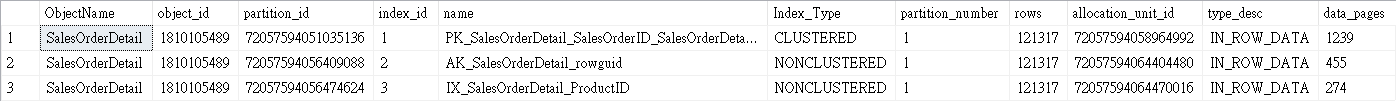 EXEC( 'DBCC IND("AdventureWorks2019","Sales.SalesOrderDetail", -1)