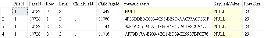 DBCC PAGE('AdventureWorks2019',1, 16464, 3) -- Intermediate Page