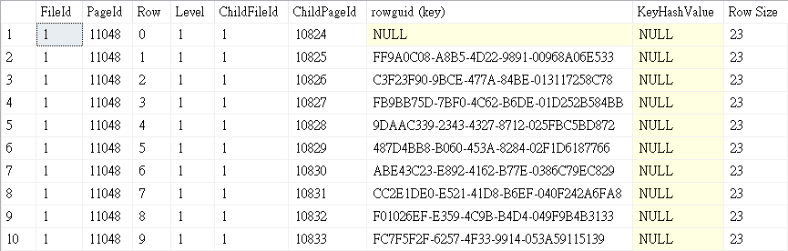 DBCC PAGE('AdventureWorks2019',1, 6376, 3) -- Root Page