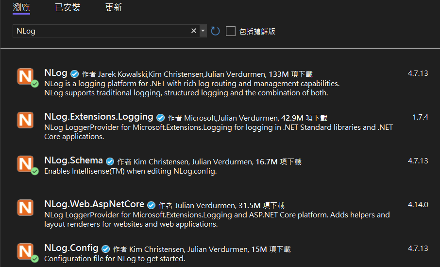 Nuget 安裝 NLog.Config,會一併自動安裝 NLog 以及 NLog.Schema。